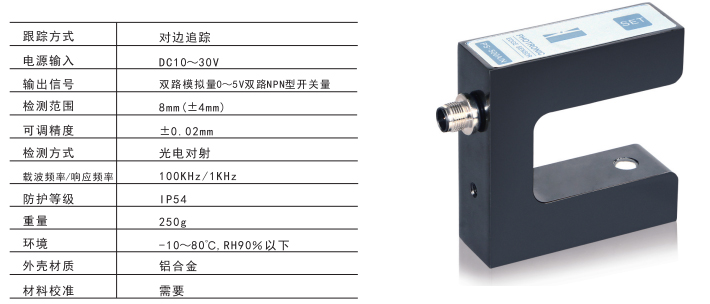 技術(shù)參數(shù) 1.支持模擬量/開(kāi)關(guān)量輸出 2.適用于不透明、透明薄膜的追邊應(yīng)用 3.可見(jiàn)光對(duì)射 4.100k頻率載波編碼,不受環(huán)境光線影響 5.檢測(cè)范圍5mm,檢測(cè)精度0.02mm 6.高穩(wěn)定性,高精度